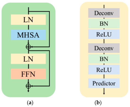 Detailed structure of the proposed pose estimator: (a) the structure of the transformer block, where LN, MHSA, and FFN denote the layer normalization, multi-head self-attention, and feed-forward network, respectively; (b) the structure of the pose estimator decoder with two deconvolution layers, where Deconv, BN, and ReLU represent the deconvolution operation, batch normalization, and ReLU activation, respectively.
