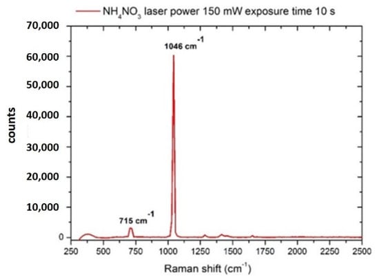 The nitrate ion has a Raman spectrum showing the characteristic peak at 1045–1049 cm−1, relative to the ν1 symmetric stretching of this molecular group [], which is used as a spectral reference structure for the detection of the ion []. In Figure 1, the Raman spectrum of a crystal of ammonium nitrate (NH4NO3) shows such a spectral feature: