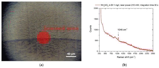 The nitrate ion was in DI water at 1 mg/L in DI. A drop of 1 μL of this solution was deposited on the Al foil. Part of the coffee ring and the relative SERS spectrum are shown in Figure 2a,b: