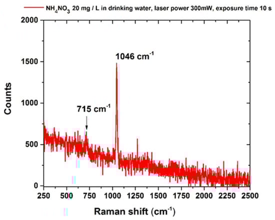 Raman spectrum of ammonium nitrate (NH4NO3) in drinking water (20 mg/L), acquired after the procedure described in Section 2. Laser spot 40 μm, laser power 300 mW, integration time 10 s.