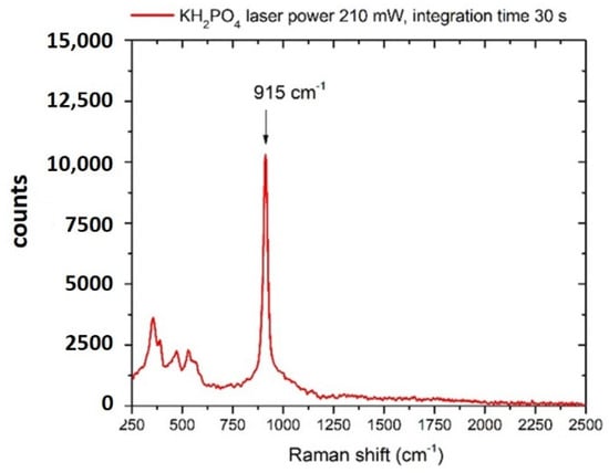 The Raman spectrum of KH2PO4 in crystalline form is shown in Figure 4. The spectral reference structure for the detection of the anion PO43− is at about 915 cm−1, assigned to the ν1 (νP–OH) vibration mode of the ion [,].