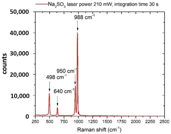 The Raman spectrum of Na2SO3 in its crystalline form is shown in Figure 6. If sodium sulfite is allowed to crystallize from an aqueous solution at room temperature, it generates heptahydrate, [] oxidizing in the air to form sulfates (SO42−) ions, so it is expected to detect some spectral features relative to sulfates [].