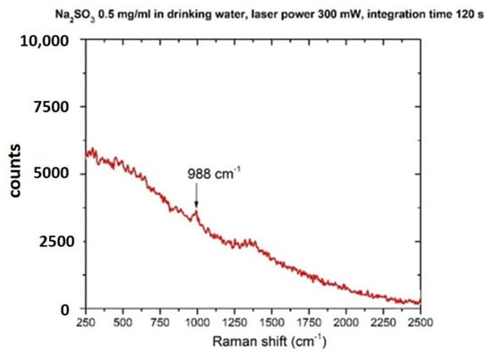 The spectrum shows the most intense bands at 950–988 cm−1, assigned to the ν1 vibration of the SO42− anion, whereas the bands at 498 and 640 cm−1 are ascribed to the ν2, ν4 vibrations, respectively []. The ν1 vibrational band centered at 988 cm−1 is specific to the sulfate anion and was observed at a concentration of 500 mg/L after integration of 120 s, as shown in Figure 7. This result indicates that sulfates can be detected in drinking water at concentrations within the suggested WHO limit [,].