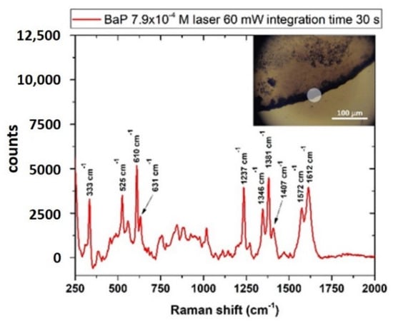 The Raman-SERS spectrum of BaP is shown in Figure 9 and was obtained by depositing the sample on nanostructured SERS substrates (MATO-S™ by Integrated Optics). As in the case of ANT, the sample was measured as a solid residue of a solution of BaP in CH3OH:CH2Cl2 mixed with g-NPS at a final concentration of 7.9∙10-4 M (200 mg/L). The scanned material was estimated by assuming that the whole substance dissolved in the 5 μL drop (1 μg) was homogeneously deposited in the coffee ring, whose width was estimated to be ~ 25 μm (inset of Figure 9) and diameter was ~ 2 mm. With a laser spot of 40 μm diameter, the quantity of sampled compound was estimated to be ~ 3.25 ng.
