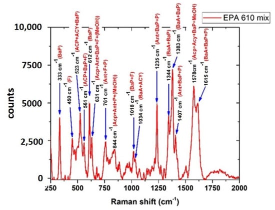 As shown in Figure 8, the spectral signatures of anthracene from a solution of 50 mg/L were evidently detected at about 394 cm−1, 751 cm−1 and1400 cm−1 in agreement with literature data [].
