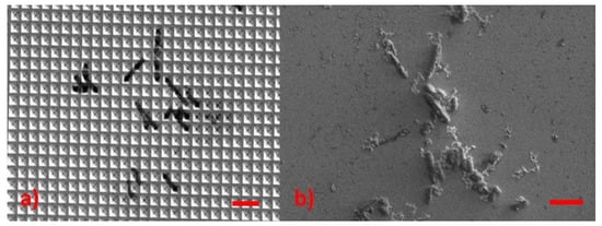 (a) Individual EC bacteria deposited on the SERS klarite substrate. (b) E. coli with g-NPS aggregates deposited on aluminum foil: reference bars (in red) are 5 μm long.