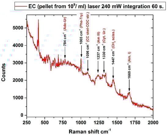 The analysis of EC suspensions in culture media did not provide any spectral signal at any of the prepared concentrations [,]. To overcome this problem, we applied a preconcentration step recommended by Hamasha et al. [], which includes repeated washing and centrifugation of the bacterial pellet in ultrapure water. The pellet was then extracted and measured, allowing to obtain the Raman spectrum of the microorganism with an integration time of 60 sec and laser power of 240 mW, with spectral features emerging from the residual fluorescence in good agreement with literature data [,]. Figure 12 shows the spectrum obtained on the pellet of 109 cell/mL bacterial suspension with the relative spectral assignments according to Kusic et al. [].