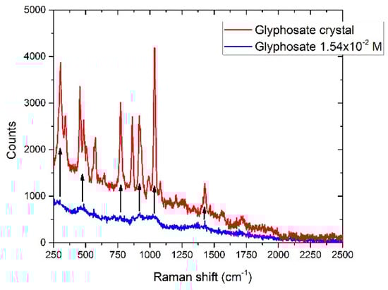 The Raman spectrum of glyphosate in crystalline form is shown in Figure 13. The spectrum of the diluted substance (1.54 × 10−4 M, 2.6 × 103 mg/L), also shown in Figure 13, presents very weak bands corresponding to those of the substance in the crystalline form [].