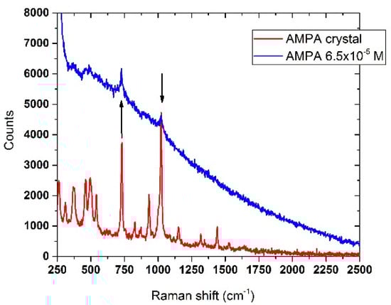 Raman spectrum of AMPA crystal (red line) compared with the analyte dissolved in drinking water (blue line), concentration 6.5 × 10−5 M (7.2 mg/mL). The black arrows indicate the Raman bands of the crystal detectable in the diluted sample. Laser spot 40 μm, laser power 90 mW, integration time 30 s.