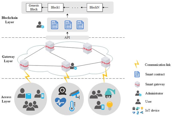 There are multiple independent access domains in the access layer, each of which has a large number of users and IoT devices accessing the system through smart gateways. Users are resource requestors; any user who has an IP address and network communication capabilities can enjoy the services (registration, authentication, access control, and so on) provided by smart gateways and blockchain, but only users authorized by the system are allowed to access the resources of a specified IoT device. Administrators are a special class of users responsible for managing the blockchain, as well as the smart gateways, able to check the blockchain ledger, deploy, update, and delete smart contracts, and verify information of each entity.