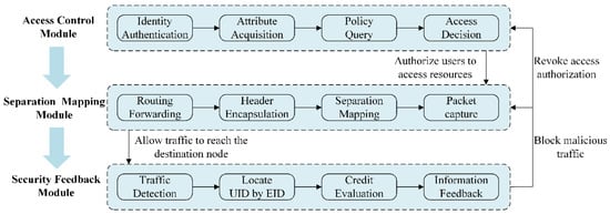 The access control module is responsible for making access decisions for users who request access to resources and has to ensure the trustworthiness of user identity and decision results by designing a reasonable access control method. The separation mapping module needs to build a new communication mechanism to intercept cross-domain communication packets between users and IoT devices at the egress of the access network, and only packets from authorized users are allowed to reach the destination nodes through the core network, to guarantee that all users accessing the IoT device resources are legal and authorized. The role of the security feedback module is to detect malicious users from the network traffic and update this information to other modules, so that they can respond in time to block malicious users from attacking the IoT devices.