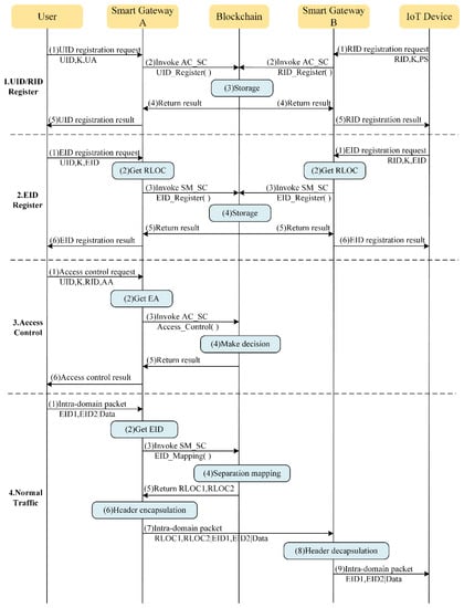 Smart gateways (SG) are the key to the system’s operation and undertake three main functions. First, each smart gateway manages an access network. Inter-domain communication traffic in the access network first need to reach the smart gateway to be forwarded to the destination through the core network formed by all the smart gateways connected together. Second, a smart gateway acts as a proxy between devices and the blockchain, receiving device requests, invoking the smart contracts deployed on the blockchain for processing, and avoiding the performance and security issues that would be caused by massive devices directly accessing the blockchain. Finally, to reduce the interaction latency with the blockchain, each smart gateway is directly deployed as a blockchain node, and all smart gateways jointly maintain the data on the chain.