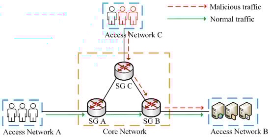 (3) A user behavior regulation method is proposed. Traffic detection methods are deployed at every smart gateway to monitor user communication traffic in real time; a credit evaluation method is designed for assessing historical user behavior in the system, and an inter-domain communication mechanism is designed based on the locator/identifier separation protocol (LISP) [] to block malicious users’ communication behavior at the egress of access network in time.