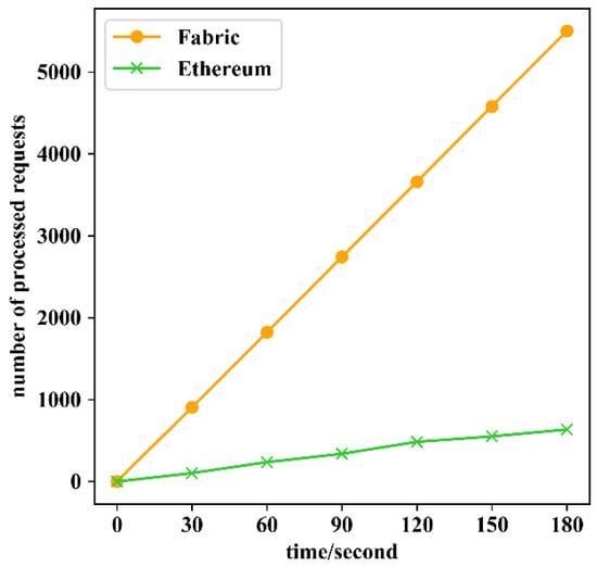 Subsequently, the processing capability of our system in the face of a large number of burst requests was examined. During the test, nine smart gateways were deployed in the system to process multiple concurrent requests sent by users. The results in Figure 17 show that the system designed in this paper exhibited better performance in processing many concurrent requests compared with other systems or methods [,,]. The reason for this was: (1) the authentication step filtered out some illegal users and saved time in performing subsequent steps; (2) the system had a simple, but reasonable contract design; (3) we chose a consortium blockchain and used consensus algorithms that were efficient (RAFT) or supported high concurrency (Kafka).