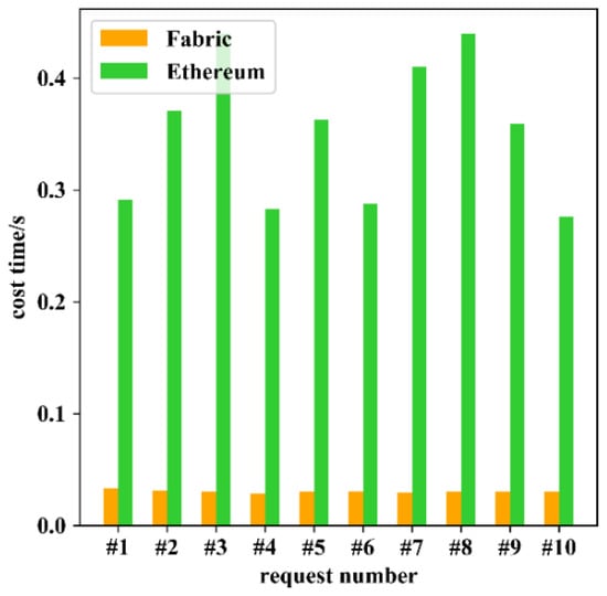 In the blockchain-based IoT access control and behavior regulation system, processes such as policy query and user information query belong to “read operation”, i.e., reading information from the blockchain; UID, EID, or RID registration belongs to “write operation”, i.e., writing information to the blockchain. The access control process is a combination of read operation, write operation, and the execution of smart contract code to implement ABAC business logic. In the following section, we will evaluate system performance by testing the speed of read and write operations performed in the blockchain.