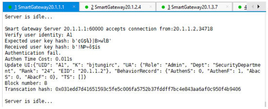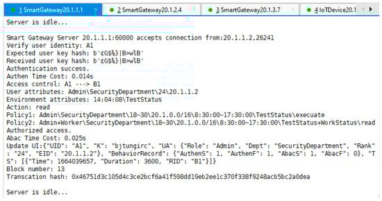 A blockchain is essentially a decentralized database, where data such as entity attributes, access control policies, user access behavior records, and smart contract codes, which will be introduced later, are stored in blocks. All blocks are jointly maintained by all blockchain nodes and are available for administrators to check and trace. Smart contracts are predefined instructions deployed on the blockchain to automatically execute contracts through code programs. As long as the contract terms are met, transactions are automatically carried out without third-party supervision []. This layer provides an application interface (API) for smart gateways to call smart contracts and the function modules of the system will fully use these contracts to interact with the blockchain to achieve various business logics.