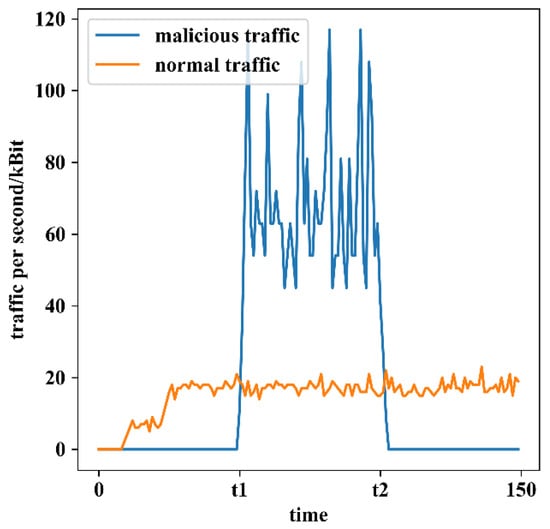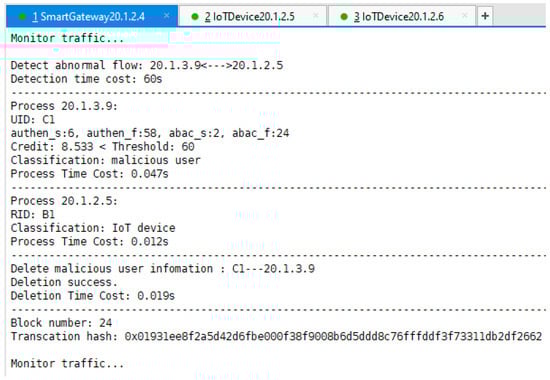 From Figure 13, we can also see that the whole process from B1 being under malicious attack by C2 to the blocking of the malicious traffic took about 61 s, whereas the detection module took 60 s to detect the malicious traffic (60 s is the time window set by reference [] and time window is a parameter that is highly related to the accuracy of detection), and the process of locating user identity, calculating user credit, reporting malicious user information, and deleting malicious user information took less than a second.