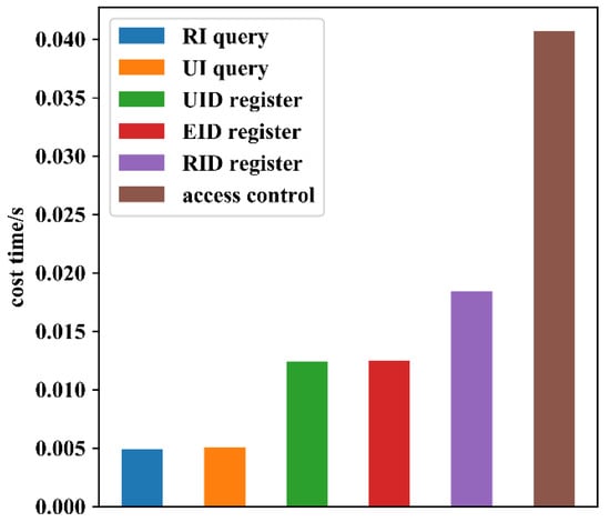 As shown in Figure 15, the time cost of a single smart gateway for processing various types of requests was tested by simulating the sending of multiple requests through A1. The results showed that the read operation was the fastest, the write operation was slower, and the access control process was the slowest. This is because the writing operation needs to generate blocks, perform node consensus, and execute ledger synchronization, which means it contains more processes than reading blocks. However, in general, the time cost of processing a single request did not exceed 50 ms and the processing rate was acceptable.