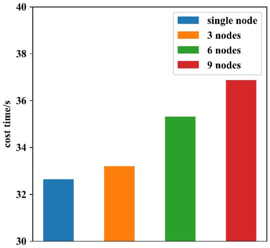 The number of blockchain nodes (i.e., smart gateways in this paper) also had an impact on system performance; thus, eight additional virtual machines were configured to act as blockchain nodes for testing. During the test, 1000 concurrent access control requests were sent to SG A to measure how long it took for a single node to finish a fixed number of requests as the number of blockchain nodes changed. As shown in Figure 16, the processing efficiency of a single node slightly decreases as the number of nodes in the blockchain increases; this is because the increase in the number of nodes slows down the consensus mechanism. Therefore, to achieve a good balance between performance and scale, the administrator must set a suitable number of nodes according to different requirements when applying this system.
