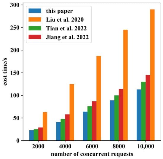 Time cost of access control process at different numbers of concurrent requests which compared with the results of the methods proposed by Liu [], Tian [], Jiang [] respectively.