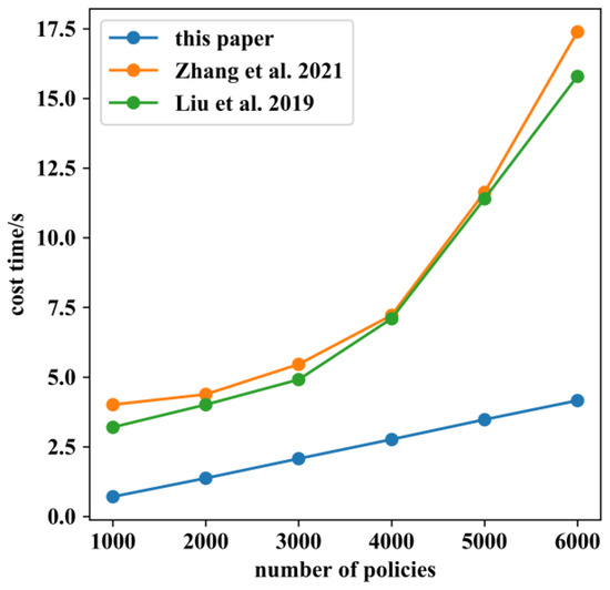 Effect of number of policies on time cost of access control process which compared with the results of the methods proposed by Zhang [] and Liu [] respectively.
