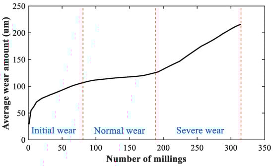 Six life cycle experiments were carried out under the above milling conditions, and the experimental data of six milling tools were obtained. During the milling experiment, multivariate cutting force signals in the X, Y and Z axes were collected. Since the milling workpiece was square and each cutting length was 108 mm, each cutting cycle time was equal. At the end of each cutting cycle, the machine was stopped, the milling tool was taken off and the microscope was used to measure the flank wear of the milling tool’s three cutting edges, which were recorded as flute1, flute2 and flute3. The collected and measured data were saved as an experimental sample, and the experiment was stopped when the milling tool was severely worn and could not work. A total of 315 samples were obtained [43]. In this paper, multivariate cutting force signals in the X, Y and Z axes of the sixth experiment were selected as the research object, and the average wear values of the three cutting edges of the milling tool were taken as the actual wear of the milling tool. Figure 3 is the average wear values curve of the milling tool. According to the changes in milling tool wear, the cutting tool wear conditions in the sixth experiment were divided into three different conditions, as shown in Table 2.