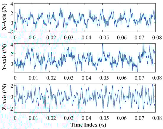 To avoid the influence of the beginning and end of cutting on the milling tool wear condition, a total of 4096 data points from 50,001 to 54,096 in each cutting cycle were selected as sample data in this paper. Multivariate cutting force signals under different wear conditions hide different nonlinear and nonstationary wear characteristics. Because of the complex frequency components of multivariate cutting force signals, it is not conducive to feature extraction directly, so the signals need to be processed in advance. Taking a group of multivariate cutting force signals at the initial wear condition as an example, the time domain diagram is shown in Figure 4.