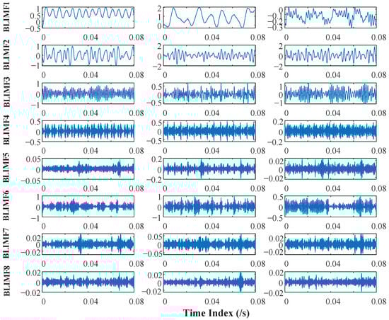 Using MVMD to decompose the multivariate cutting force signals, multiple sets of multivariate BLIMFs containing a large number of nonlinear and nonstationary wear characteristics can be obtained. After comparing the test results many times, the decomposition parameter , the penalty factor and the default values of other parameters were selected. The decomposition results of multivariate cutting force signals are shown in Figure 5.