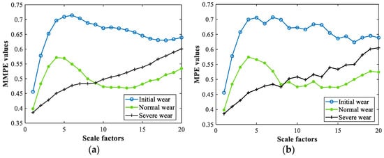 Entropy values denoting 3 different wear conditions. (a) MMPE and (b) MPE values.