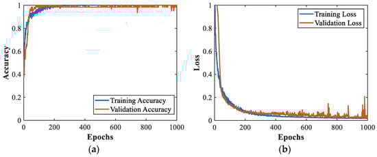 (a) The change curves of accuracy during 1D CNN training process. (b) The change curves of loss during 1D CNN training process.