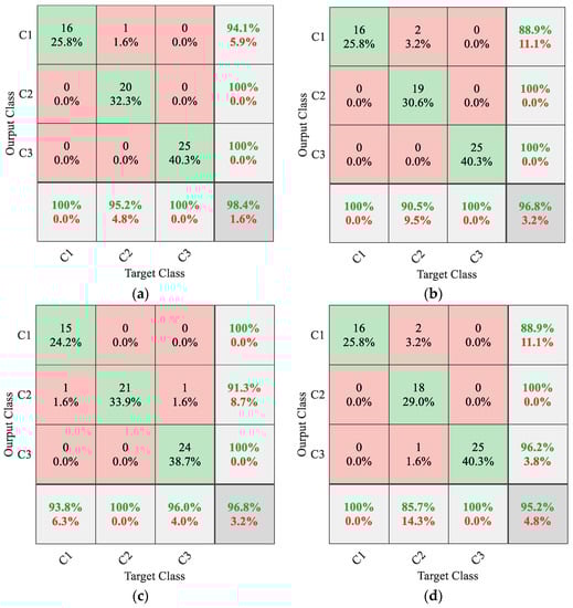 In Figure 8, the abscissa represents the real wear condition of the testing set, and the ordinate represents the predicted results of 1D CNN. Figure 8a illustrates that the prediction accuracy of 1D CNN model was 98.4%, which indicates that the proposed method can effectively extract nonlinear characteristics of tool wear and realize accurate tool wear condition classification using 1D CNN. To verify the superiority of the proposed method, several sets of different methods were compared in this paper, each of which uses the same dataset. Using the MMPE values of the first eight orders of multivariate BLIMFs obtained by MVMD as the input of the genetic algorithm-support vector machine (GA-SVM), the prediction accuracy was 96.8%, which is shown in Figure 8b. Using the MMPE values of the first eight orders of multivariate IMFs obtained by multivariate empirical mode decomposition (MEMD) as the input of 1D CNN, the prediction accuracy was 96.8%, which is shown in Figure 8c. Using the MPE values of the first eight orders of multivariate BLIMFs obtained by MVMD as the input of 1D CNN, the prediction accuracy was 95.2%, which is illustrated in Figure 8d.