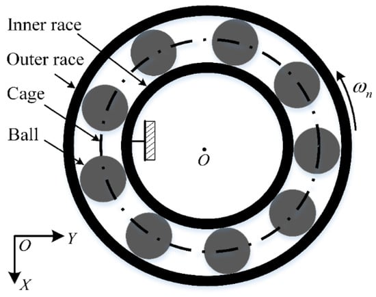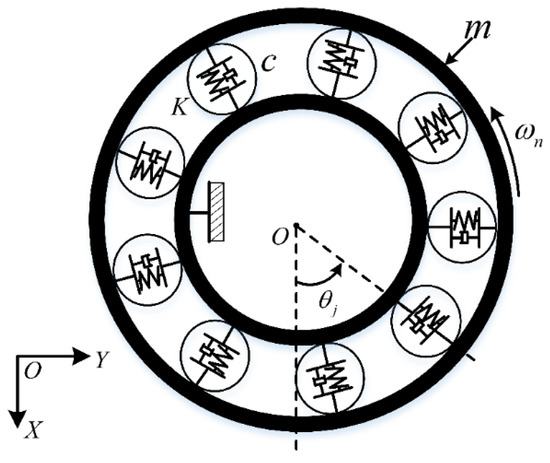 The flywheel bearing is different from ground bearings; namely, the operation of flywheel bearing is the outer race. In the model, the inner race is assumed to be stationary, while the outer race is regarded as the rotational unit, as shown in Figure 1. The outer race has 2-DOF in the horizontal and vertical directions; the rolling element–raceway contact is considered as a spring–damp system, and contact force is determined according to the Hertzian contact theory.