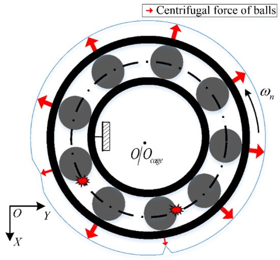 Meanwhile, the centrifugation trend of the fault balls is considerably suppressed as the cage friction fault occurs. Thus, the entire centrifugal force acting on the outer race can become unbalanced, as illustrated in Figure 4. At this time, the heavy out-of-balance force occurs because of the high-speed rotation of the outer race.