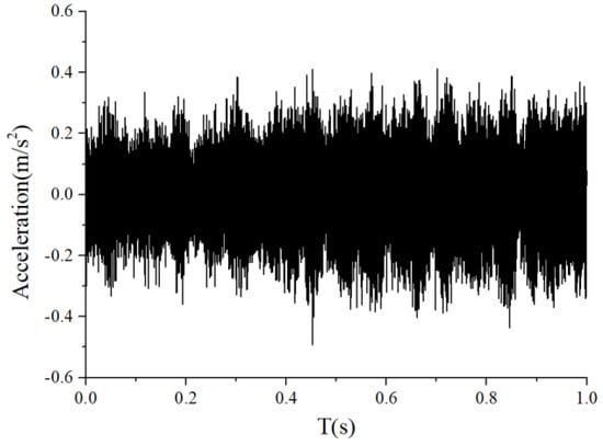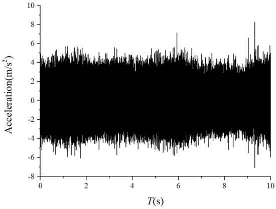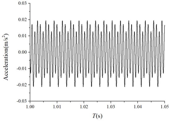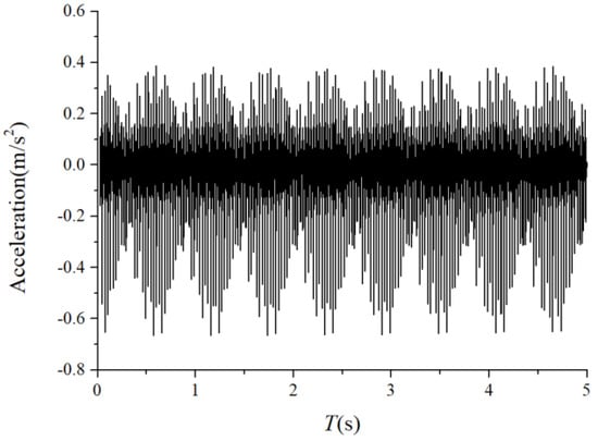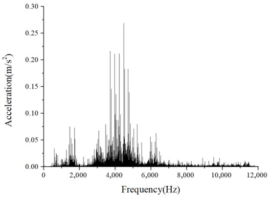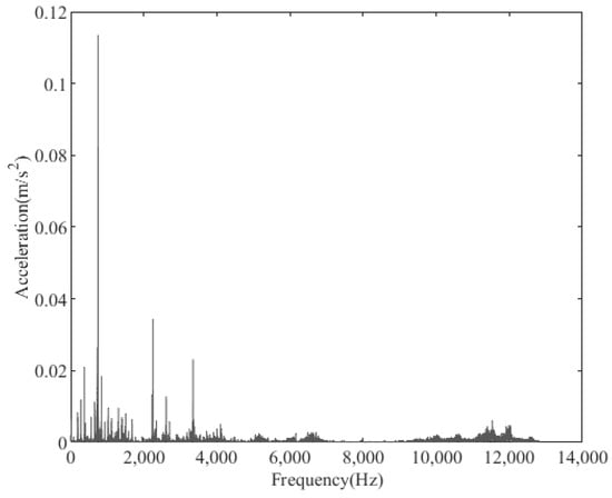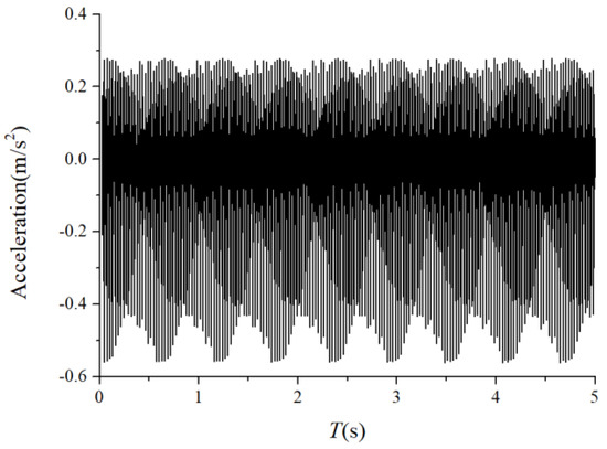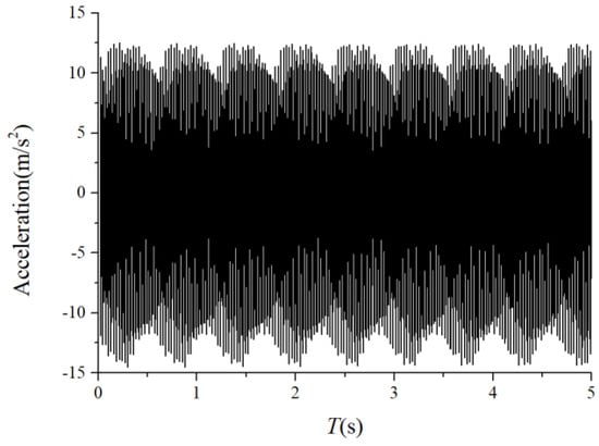 The periodic variation in the assembly stiffness that occurs as the cage rotates was the most influential cause of the rolling bearing vibration, which is the varying compliance (VC) vibration [60]. The VC vibration characteristics were used to verify the accuracy of the solution. The frequencies of the MB-ER-16K deep groove bearing are listed in Table 2. The vibration responses were calculated under normal bearing conditions; Figure 6 and Figure 7 illustrate the simulation results. Figure 6 illustrates the vibration acceleration in the vertical direction, and Figure 7 illustrates the envelope spectrum of the acceleration signals.