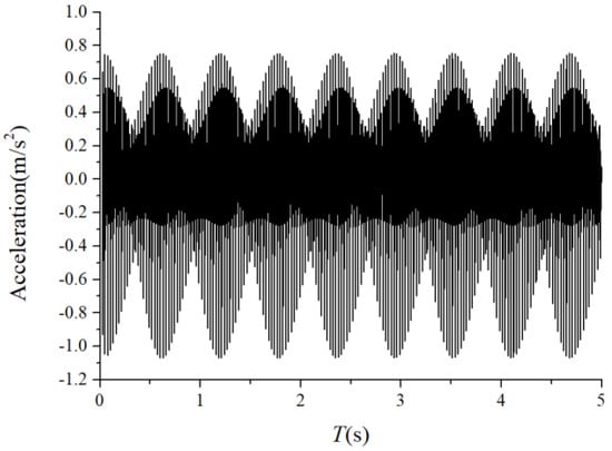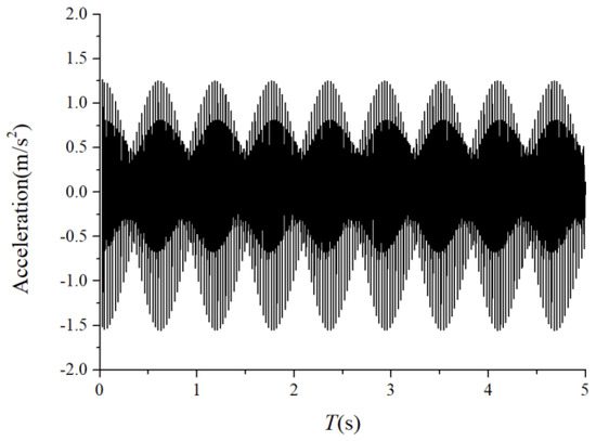We assumed that the stiffness change factor was 0.1 while the fault balls were numbered two and four. The vibration responses were calculated in two loading environments: light and heavy loads. For the light load case, the reference range of due to the unbalance of the outer race ranged from 1 N to 100 N. Figure 8 and Figure 9 illustrate the vertical acceleration time-domain waveforms and envelope spectrum for a 100 N amplitude coefficient . For the heavy load case, a constant 100 N force was applied on the outer race in the vertical and horizontal directions while was set to 0 N. Figure 10 and Figure 11 show the vertical acceleration time-domain waveforms and envelope spectrum at a constant force of 100 N. We drew the following conclusions from the simulation results: