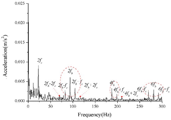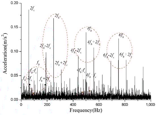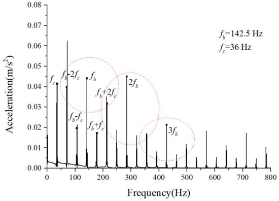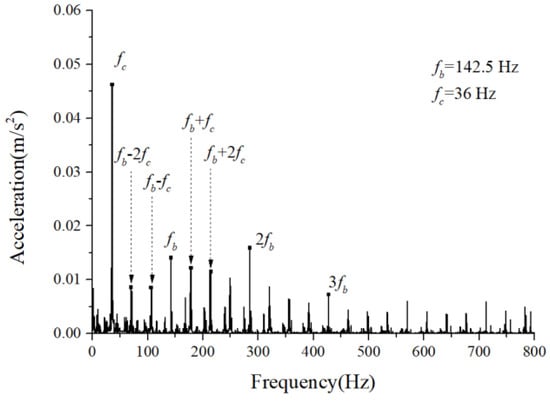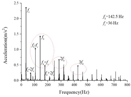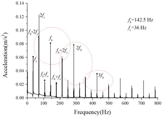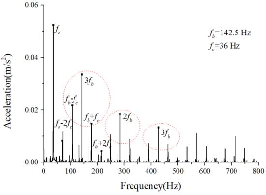 For the monitoring results of the bearings with slight amounts of friction, Figure 36, Figure 37 and Figure 38 show the acceleration time-domain waveforms, spectrum, and envelope spectrum, respectively. Figure 39, Figure 40 and Figure 41 illustrate the corresponding monitoring results of the severe cage-ball friction. As shown in Figure 38, many multiple frequency components exist, such as the cage revolution and ball spin frequencies. In addition, the obvious first-order modulation sidebands of can be observed. Likewise, it can be observed that the second-order sidebands of are more obvious than those of the first-order sidebands. The variation behavior of the modulation sidebands in the simulation is similar to that in the experiment. Thus, the test results verify the accuracy of the simulation results to a certain extent.