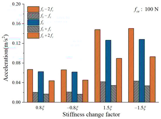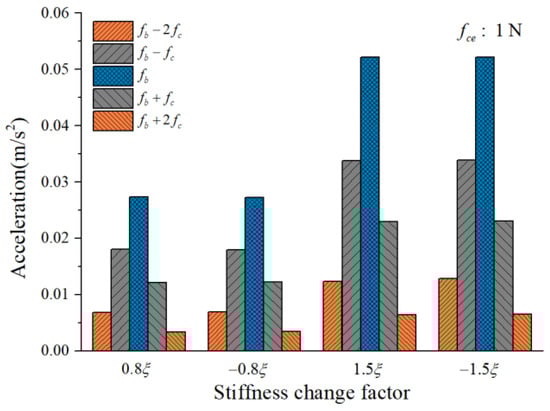 To study the influence of the cage-ball friction fault on the bearing vibration, we reduced the stiffness change factor to and gradually increased it to in small ranges. The amplitude coefficient was 1 N and 100 N. The characteristics of the vertical acceleration signal were then analyzed. Figure 12 and Figure 13 illustrate the vibration acceleration RMS values under different values of (100 N, 1 N). It could be seen that the stiffness change factor substantially affected the vibration energy at a certain value of . This effect occurred because represents the friction fault severity, and the larger friction fault can stimulate a much larger vibration energy in the bearing system. Figure 14 and Figure 15 illustrate the peak value of the envelope spectrum curve at the sideband modulation family of the first-order ball spin frequency . These figures show that the modulation sideband phenomenon under different values of (, ) was mostly unchanged in . Moreover, the acceleration RMS value and the amplitude of the characteristic frequencies were close regardless of the impact between the cage and balls in the positive direction (+) or negative direction (−); the energy from the cage-ball friction fault was transferred through the balls to the outer race in the variable stiffness method, which lacked any directionality.