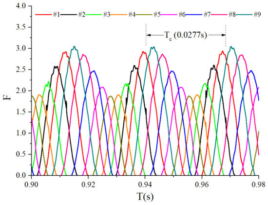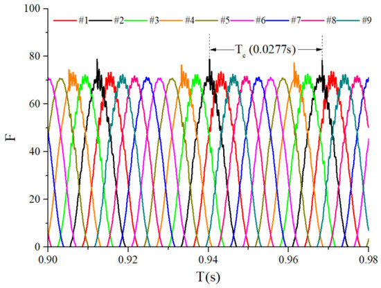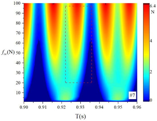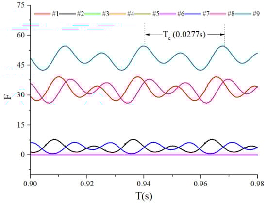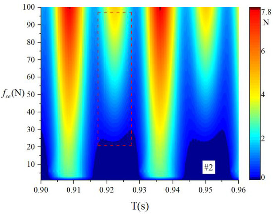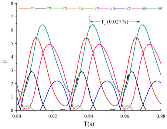 When the bearings are running, the load region is the angular extent of the raceway contact deformation. The load distribution highly influences the vibration and dynamic characteristics [61], and the radial load has a complex relationship with the load region. Owing to the unbalancing effect of the outer race, the load region varies in the light load case; however, the load region variation is rarely considered in the study of the cage friction fault. We investigated the influence of the unbalance force on the load region in the light load case by considering the rolling element–raceway contact force. The vibration responses of the cage friction fault under a finite number of unbalance values were simulated. The unbalance effect was achieved in the simulation by changing the amplitude coefficient of the out-of-balance force. Figure 16 shows the time domain waveform of the rolling element–raceway contact force in the heavy load case, and we can see that there is no amplitude fluctuation. Figure 17, Figure 18 and Figure 19 show the time domain waveform at the amplitude coefficient of 1.2 N, 8 N, and 100 N. The figures show that the periodic out-of-balance force changes the load distribution, and this changing ability is related to the amplitude of the out-of-balance force; this phenomenon differs from that of the constant load. The peak value of the rolling element–raceway contact force changed under a weak outer race unbalancing effect. In addition to changing periodically, the peak value change frequency also doubled when the effect was significant. The results of other amplitude coefficients at #2 and #7 are illustrated in Figure 20 and Figure 21; the second peak can be observed in the red dotted frame in the figures. We can see that the force amplitude increases as increases.