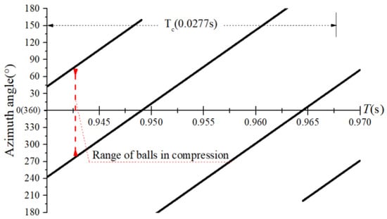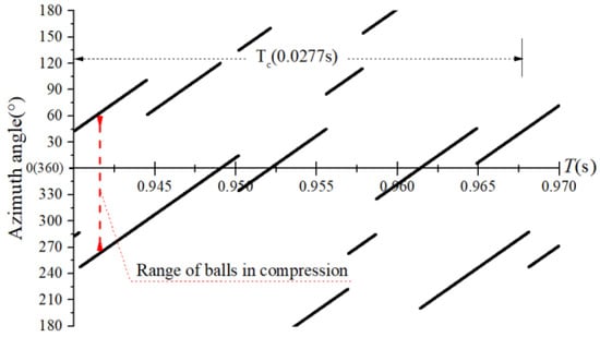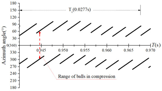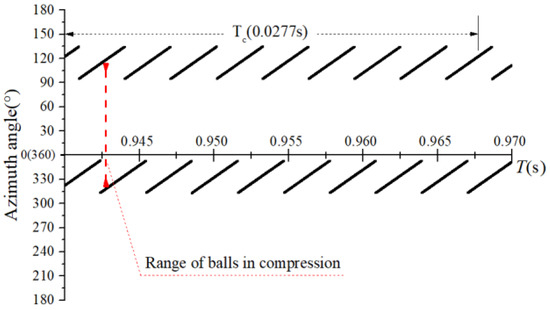 According to the assumptions of the rigid ball, the variation law of can be replaced equivalently by the reaction force , and then the cage–ball excessive friction problem can be addressed. The degree of hold-down between the fault balls and raceway varies according to the azimuth angle of the balls; thus, the rolling element extrusion effect on the cage pockets differs, and the amplitude varies with the azimuth angle of the fault balls. To account for the association between and the azimuth angle, we proposed a variable stiffness method to simulate the effects of the cage–ball friction fault: the load-deflection factor of the fault balls varies with time and is expressed by the block-pulse function. The rolling element–raceway contact force calculated by the variable stiffness method changes simultaneously with the degree of hold-down between the fault balls and raceway. Therefore, the effect of the cage–ball friction on the nonlinear vibration response can be determined by indirectly varying . The variable stiffness method is detailed in the next section.