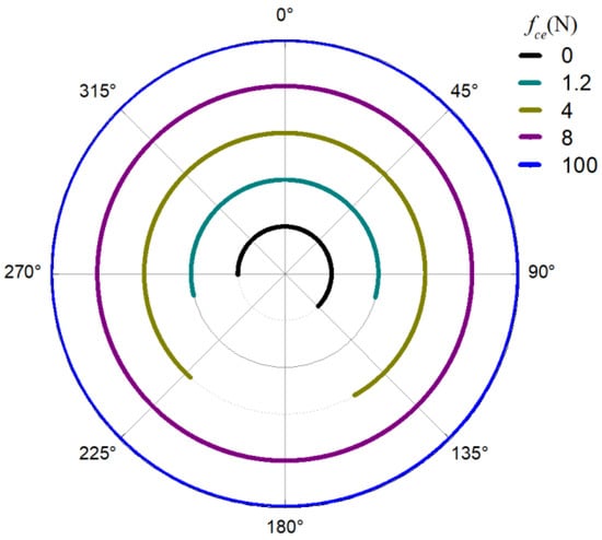 The direction of is along the opposite side of the fault balls, as illustrated in Figure 5, and the association in terms of direction is achieved by adjusting the initial reference position . The variation period of can be divided into two categories. When the bearings are in a light load state and because induces the load region variation, the variation period is equal to the cage evolution period. However, the variation period does not exist when a constant force exists that can contend with the effect of . Owing to certain factors such as lubrication, rotational motion, and collision impact, the amplitude relationship between the out-of-balance force and the reaction force is nonlinear, and it is difficult to express them mathematically. As an upper limit exits for the effect of the hold-down between the fault balls and raceway, the reference range (<constant) is used to examine the influence of the out-of-balance force amplitude on the bearing vibration. Once cage friction faults occur, a value must be obtained in the range that can represent the out-of-balance degree of the outer race. Thus, the friction fault is intensified as the value increases.