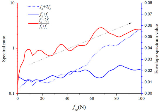 (1) The envelope spectra clarify the frequency of the cage and ball as well as their dividing frequency components, which result from the friction fault. Some modulation sidebands also take the cage frequency as the interval. The amplitude of the second-order sidebands of is significantly higher than that of the first-order for the light load case; the result of the heavy load case is the opposite. The sideband regularities around the harmonic components, such as 1X, 2X, and 3X of the ball spin frequency, are similar. Therefore, the characteristic spectra lines caused by the cage-ball friction are highly sensitive to the loading environment. As the external load is insufficient to offset the unbalancing effect of the outer race, the load region changes, causing the envelope spectra pattern.