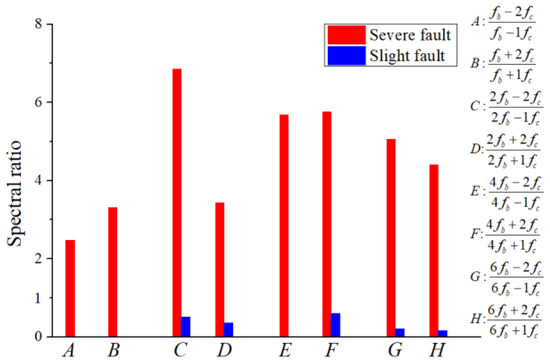 The sideband ratios graph is shown in Figure 42. The spectral ratio was low when the cage friction fault was slight, and the ratio became significantly high when the cage friction fault was severe. This phenomenon qualitatively reflects the highly positive correlation between the ratio and the severity of the cage friction fault.