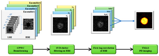 For the flow component, its phase coherence factor will be equal to one because all of the flow phasors are in phase (i.e., = constant for all m). For the noise component, on the contrary, the corresponding phase coherence factor will be less than one because all of the noise phasors are uncorrelated (i.e., changes randomly among m). Therefore, the TMAS power Doppler will preserve the image pixels in the blood flow region, while those in the background noise region will be relatively suppressed. Note that that the extent of the noise suppression depends on the pt value, the number of ensembles and the lag number. Take pt = 2 in (4) as an example, the TMAS power Doppler actually comes from the square of the coherent summation of all of the magnitude-scaled Doppler correlations. One should note that, after the square of the summation is multiplied out, there are actually a total of (M − L)2 terms that are coherently combined for the resultant PD estimation. Therefore, it is expected that the case of pt = 2 could outperform the counterpart of pt = 1 in the suppression of the uncorrelated thermal noise because the number of random noisy components in the coherent summation increases from M − L to (M − L)2. The signal flowchart of the proposed TMAS power Doppler is schematically represented in Figure 1. Figure 1 shows that the CPWC beamforming is firstly adopted to produce a temporal sequence of HRI. After clutter filtering, the correlations among the temporally neighboring HRI with a lag number of L are computed. Here, the first-lag correlation is demonstrated in Figure 1 as an example, but it can be replaced by any other higher-lag correlation according to the flow velocity that is of interest. Finally, the multiply-and-sum operation is performed on these correlations to highlight the temporal coherence in the power Doppler detection. It should be emphasized that due to the baseband nature of Doppler signal, the TMAS signal processing in Figure 1 does not generate a DC or harmonic component as in [21] and it does not demand for any filters.