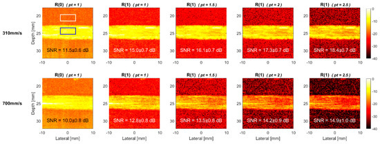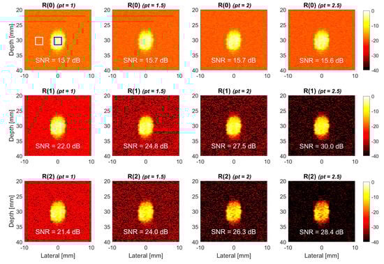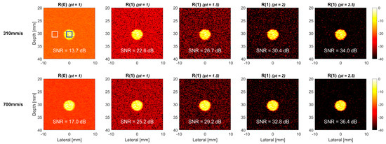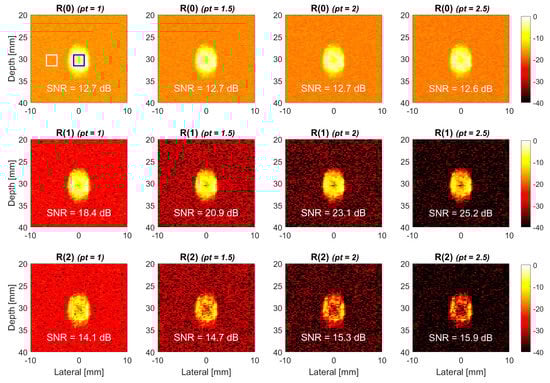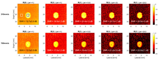 The results in Figure 3 indicate that the noise level in the background region of the higher-lag images such as R(1) and R(2), which consistently decrease with the pt value. For R(1), this leads to the increase in the SNR from 22.0 dB in reference to 24.8 dB, 27.5 dB and 30.0 dB in the TMAS method, respectively, with the pt values of 1.5, 2.0 and 2.5. For R(2), the SNR increases from 21.4 dB in reference to 24.0 dB, 26.3 dB and 28.4 dB in the TMAS method, respectively, with the pt values of 1.5, 2.0 and 2.5. It should be noted that with the same pt value, the SNR of the R(2) image is consistently lower than that of the R(1) counterpart. This is because the R(2) image suffers from relatively higher signal decorrelation, and thus, it has a lower Doppler power in the blood flow region. For example, when the pt value is 2.5, it is visually detectable that the brightness in the blood flow region decreases in the R(2) image relative to the R(1) image. Nonetheless, for the R(0) images, it is also noticeable that both the signal and the noise levels appear to be unchanged with the pt value, and thus, the corresponding SNR remains virtually the same.