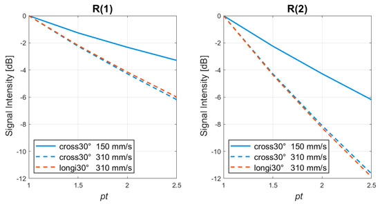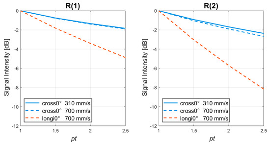 The corresponding signal intensity of the blood flow region in Figure 8 and Figure 9 is also demonstrated in Figure 10 as a function of the pt value for the 0° vessel. The results in Figure 10 confirm a more severe signal decorrelation in the longitudinal view than they do in the cross view. For example, when the pt value increases from 1 to 2.5, the loss of the R(1) signal intensity at the flow velocity of 700 mm/s is about 5 dB in the longitudinal view, while it is about only 2 dB in the cross view. Similarly, the corresponding loss of the R(2) signal intensity is about 8 dB in the longitudinal view, while it is less than 3 dB in the cross view. This observation suggests that the blood flow in the longitudinal view evidently introduces more signal decorrelation than it does in the cross view in the TMAS power Doppler images. In other words, in the absence of axial flow, the direction of non-axial flow also has impacts on the degree of signal decorrelation. It is reasonable to observe that the lateral flow leads to higher signal decorrelation than the elevational flow does because the beam width in the lateral direction is generally narrower than it is in the elevational direction due to both the dynamic receive beamforming and the coherent compounding of multiple plane wave transmissions. Consequently, due to the low signal decorrelation of the 0° vessel in the cross view, the difference in the cross-view signal intensity between the flow velocities of 310 mm/s and 700 mm/s is negligible (i.e., <1 dB) in Figure 10 for both the R(1) and R(2) images.