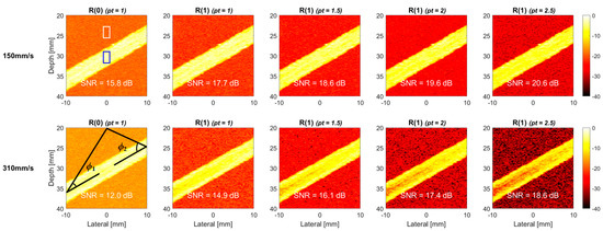 Simulated TMAS power Doppler images of longitudinal-view flow phantom for R(1) images with the pt values of 1.0, 1.5, 2.0 and 2.5, respectively, from left to right. R(0) image is also provided as a reference. The flow velocity is 150 mm/s (upper) and 310 mm/s (lower). The inclined angle of the flow vessel is 30°.