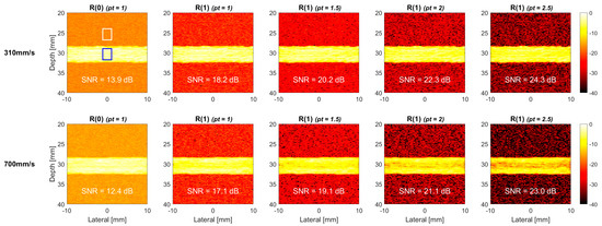 The TMAS power Doppler images of the horizontal 0° vessel in the commercial flow phantom are provided in Figure 11 and Figure 12, respectively, for the cross view and longitudinal view at both flow velocities of 310 and 700 mm/s. Similar to the corresponding simulation results in Figure 8 and Figure 9, the power Doppler images of the experimental phantom also show more severe signal decorrelation in the longitudinal view than they do in the cross view. This can be visually identified by the rapid decrease of the image brightness in the blood flow region with the pt value in the longitudinal view. The signal decorrelation also increases with the flow velocity, as was expected in the simulations. This can be visually identified by the rapid decrease in the image brightness in the blood flow region with the pt value in the longitudinal view. The signal decorrelation also increases with the flow velocity, as was expected in the simulations. This is particularly noticeable for the longitudinal-view power Doppler images in Figure 12 which demonstrate a significant loss of the signal intensity not only in the center line, but within the entire vessel. This suggests that the blood flow in the experimental vessel may not exhibit the ideal laminar distribution as it does in the simulation. Consequently, even though the R(0) reference image at the flow velocity of 310 mm/s has a similar SNR between the cross view (12.7 dB) and the longitudinal view (11.5 dB), the SNR of cross-view R(1) image can significantly improve to 25.9 dB with the pt value of 2.5, while the longitudinal-view counterpart only improves to 18.4 dB.