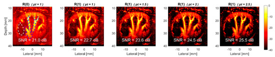 The TMAS power Doppler images in the presence of axial flow are demonstrated using the dataset of the rabbit’s kidney in Figure 13. Visual observations also show that the power Doppler images with TMAS generally have a lower noise level in the background than those that were obtained with the conventional methods. On the contrary, the decorrelation of the blood signal due to the flow in the axial direction is less noticeable because the estimated flow velocity remains within the Nyquist rate in the dataset of the rabbit’s kidney. Consequently, the experimental SNR increases from 21.0 dB in R(0) image to 22.7 dB, 23.6 dB, 24.5 dB and in 25.5 dB, respectively, with the pt values of 1.0, 1.5, 2.0 and 2.5. Taking the pt value of 2.5 as an example, the improvement in the Doppler SNR is 4.5 dB when we are compared it to the reference R(0) image. Nonetheless, it should be noted that the R(1) image with the pt value of 2.5 also provides an SNR improvement of 2.8 dB when we are compared it to the conventional higher-lag method (i.e., R(1) image with the pt value of 1.0).