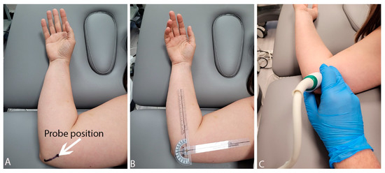 Probe position (A), control of the position of the elbow joint (B) and examination phase (C).