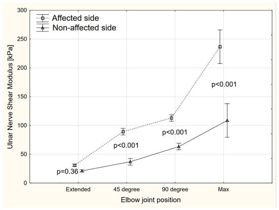 The ANOVA revealed significant side-to-side differences (F = 86.2, p < 0.001) in the ulnar nerve elasticity at 45°, 90°, and maximal elbow flexion, but not in extension (Figure 3). Compared to the non-affected side, the mean shear modulus on the affected side was higher by 52.3 kPa (95% CI 31.3–73.2), 49.5 kPa (95% CI 28.6–70.5), and 127.8 kPa (95% CI 106.9–148.7) for 45° of elbow flexion, 90° of elbow flexion, and maximal elbow flexion, respectively.